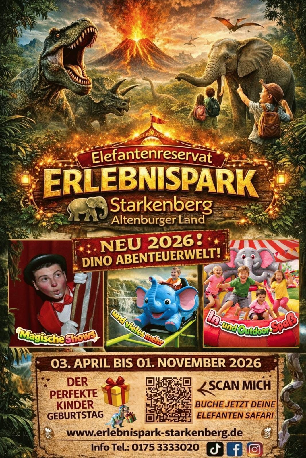 Der Erlebnispark Starkenberg lädt Sie herzlich ein, unsere spektakuläre Erlebniswelt Jurassic World zu entdecken. Begegnen Sie beeindruckenden Dinosauriern, bestaunen Sie das Elefantenreservat und erleben Sie einen unvergesslichen Tag voller Abenteuer für die ganze Familie. Lassen Sie sich durch die Darbietungen vieler talentierter Artisten in unserer Dino Live Show verführen. Ob Groß oder Klein lassen Sie bei uns Ihren Tag besonders sein – bei uns wird Geschichte lebendig und Erlebnisse bleiben in Erinnerung. Planen Sie Ihren Besuch und entdecken Sie die Urzeit-Welten an nur einem Tag!